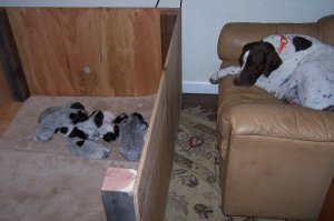 Quote from the front office, Managing Partner, Pam Brann of Winter Creek, "the boys first week of June went as expected. Mom Bling is handling the groceries for the team and medical (tails & dew claws) has been accomplished by the staff. The boys are all putting on weight and some are starting to darken up. The exercise regime of crawling onto the puppy pile is on-going.